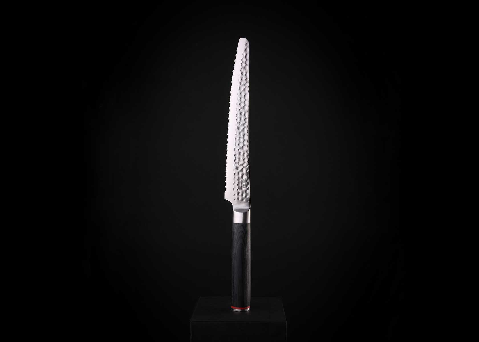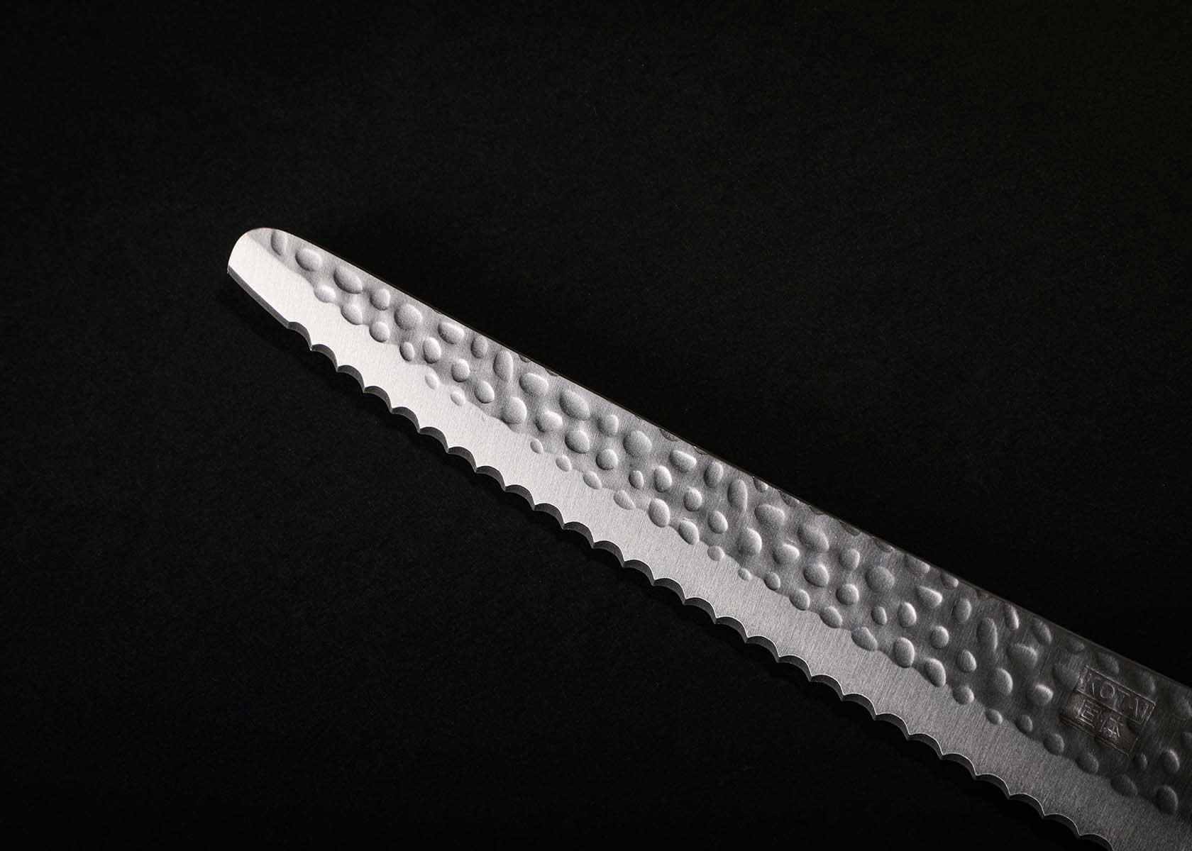 Als je brood en andere baksels met een harde korst probeert te snijden, zonder de delicate binnenkant te pletten, is dit Japans broodmes van KOTAI wat je zoekt. Ook voor het snijden van broodjes, ananas, tomaten of watermeloen is dit mes ideaal. U maakt er eenvoudig mooie sneetjes van dankzij het gekartelde lemmet. Het gehamerde “Tsuchime” patroon ziet er prachtig uit en heeft ook een belangrijke functie. Het patroon creëert namelijk kleine luchtbellen tussen het mes en het voedsel dat wordt gesneden. Dit vermindert de weerstand, waardoor er geen voedsel aan het blad blijft kleven.