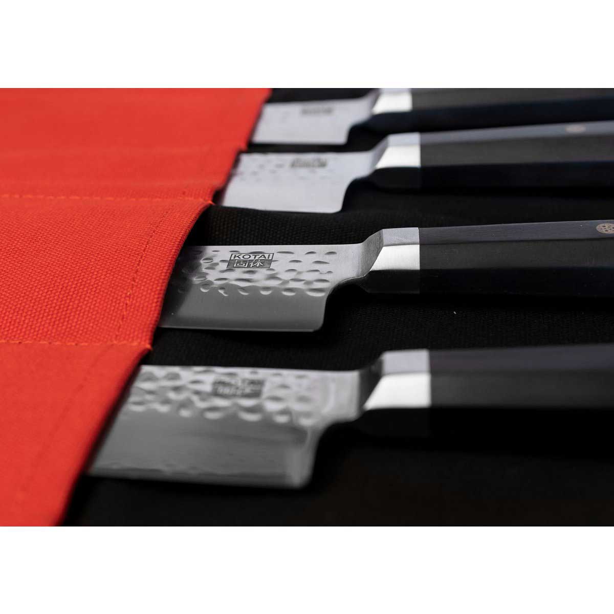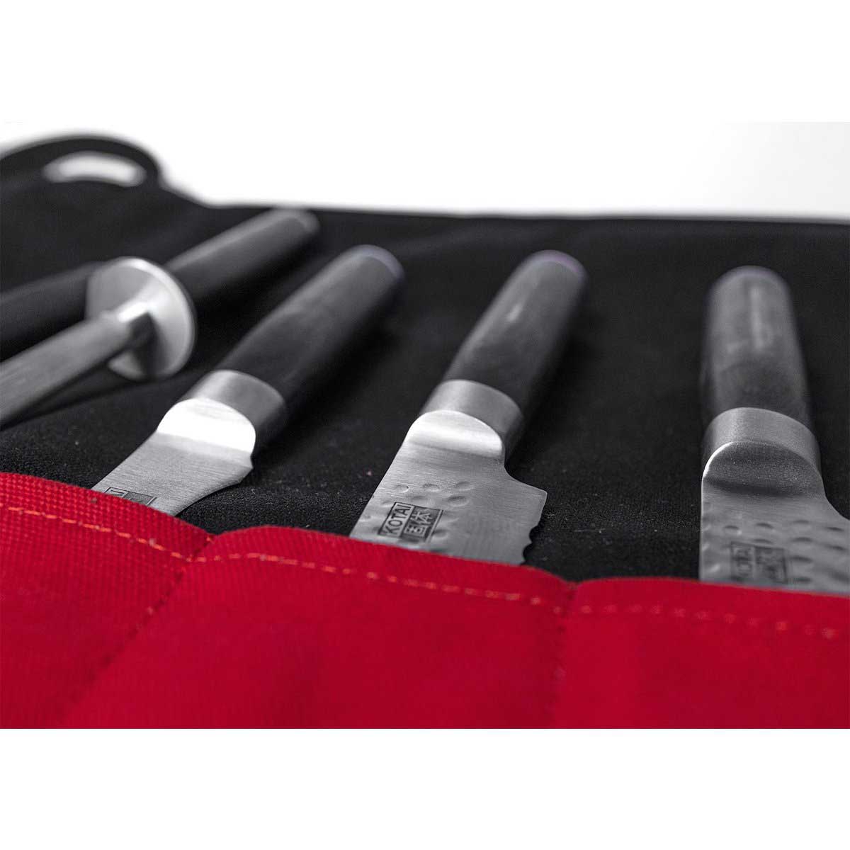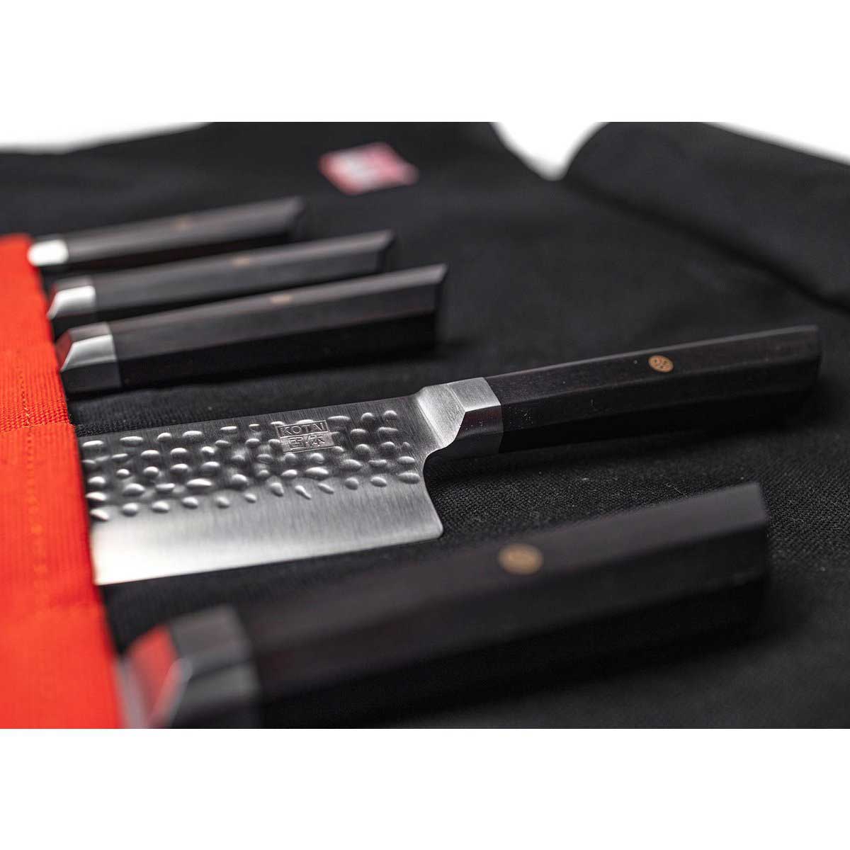 Met deze handige oprolbare etuis bescherm je al jou Kotai Japanse messen zodat deze veilig en zonder kans op schade opgeborgen kunnen worden. De etuis heeft plaats voor 6 messen en een aanzetstaal. Hierdoor kan je jou messen ook handig meenemen.