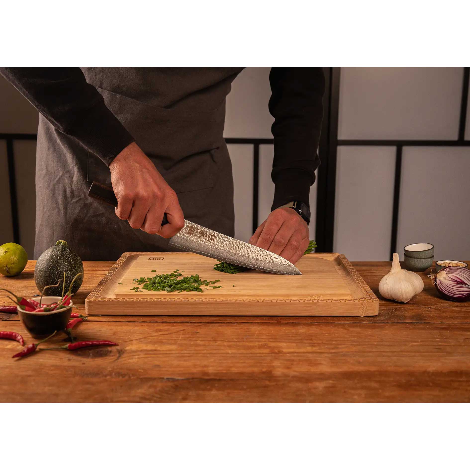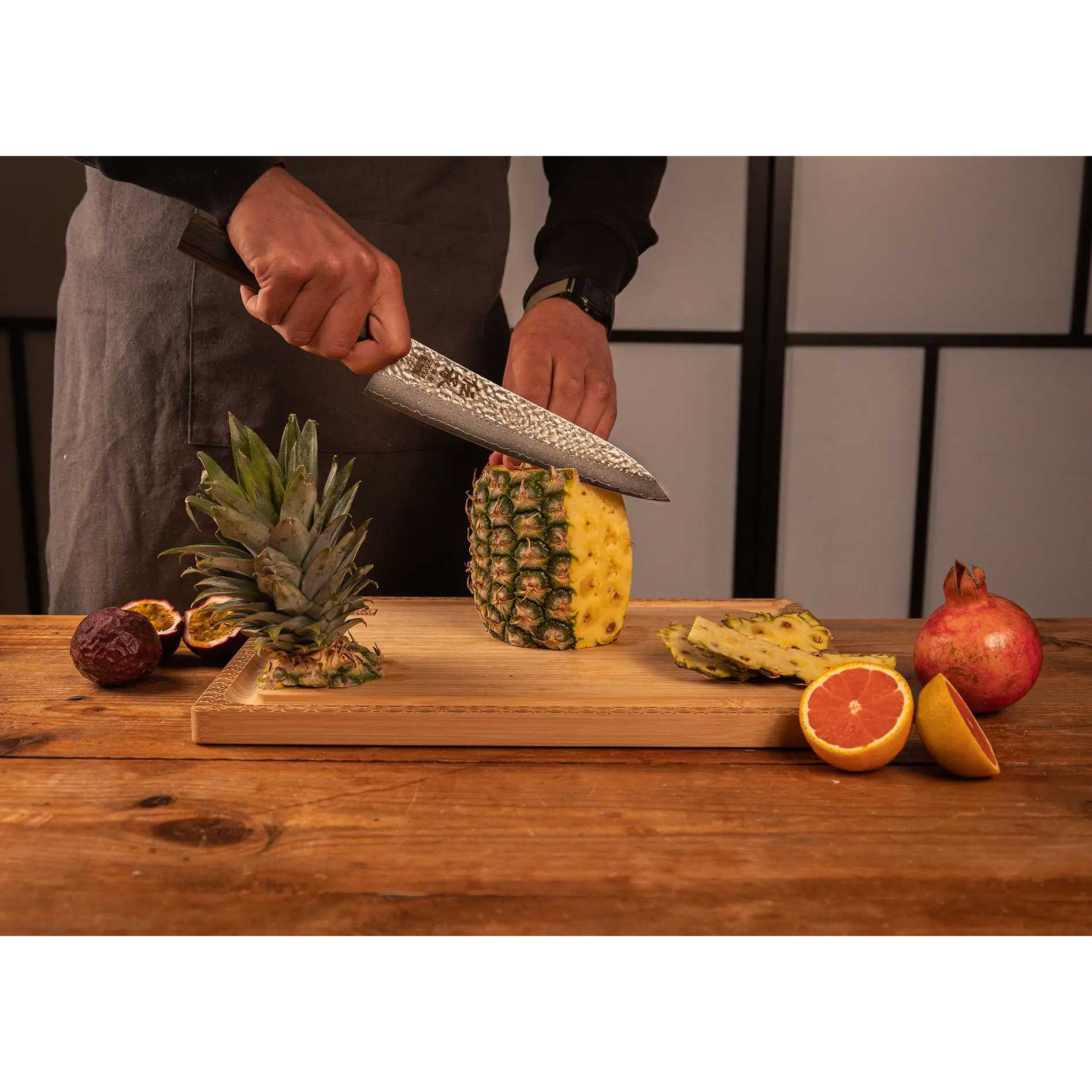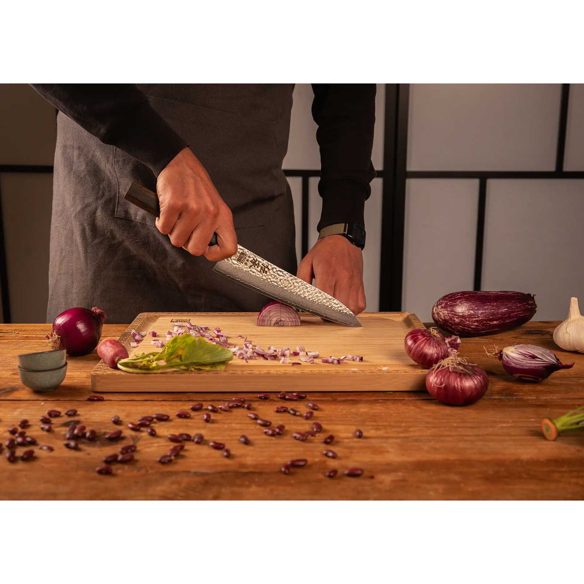 Het lemmet van 21 cm is gemaakt van VG-10 Damascus staal, wat zorgt voor uitzonderlijke scherpte en roestbestendigheid. De gehamerde afwerking zorgt voor een visueel aantrekkelijke textuur en verhoogt de sterkte en duurzaamheid van het mes. Het lemmet heeft een relatief vlakker profiel vergeleken met Duitse messen, wat het ideaal maakt voor hakken en snijden. De lichte kromming van de buik maakt het mogelijk om een wiegenbeweging te maken voor moeiteloos snijden en hakken, terwijl de verlaagde punt precisiewerk vergemakkelijkt.