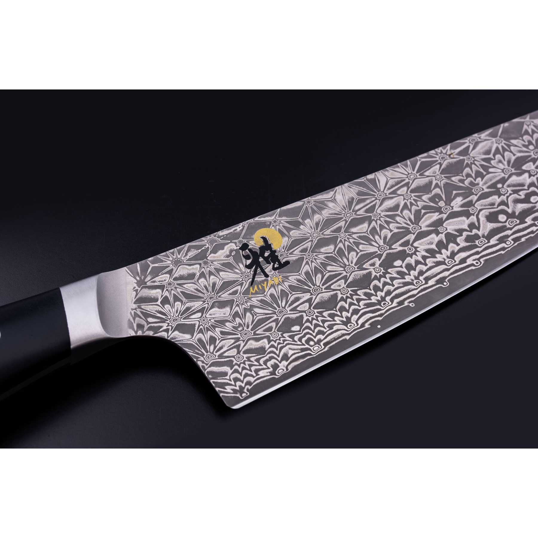 Het MIYABI 800DP Gyuto Chefsmes is een toonbeeld van verfijning, met zijn opvallende damastpatroon en elegante gouden details in het handvat. Deze elementen weerspiegelen de rijke traditie van de Japanse smeedkunst en brengen een stukje kunst naar je keuken.