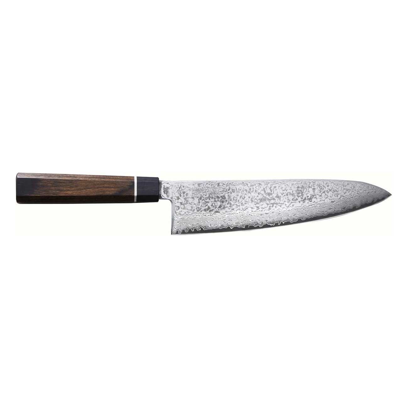 Met een hardheid van ca. 61 HRC (Rockwell) behoudt dit mes zijn scherpte aanzienlijk langer dan conventionele messen. Het is perfect voor intensief gebruik in zowel professionele als thuiskeukens. De ergonomische donkere pakkahouten greep ligt stevig in de hand en zorgt voor maximale controle — ook bij lange snijbeurten.