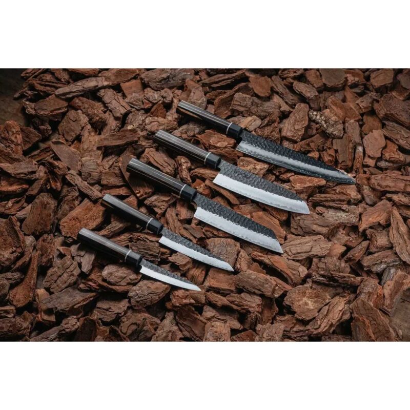 De gehamerde Tsuchime-afwerking voorkomt dat ingrediënten blijven kleven, wat snijden niet alleen sneller maar ook veiliger maakt. De karakteristieke damaststructuur maakt elk exemplaar visueel uniek – een sieraad in iedere keuken.
